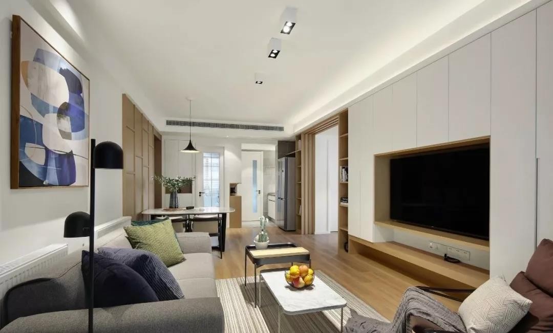 客厅整体设计的十分简洁,未加过多修饰的白墙,从视觉上延伸空间,增强通透性。蓝色挂画打破单调,丰富了客厅的层次感。