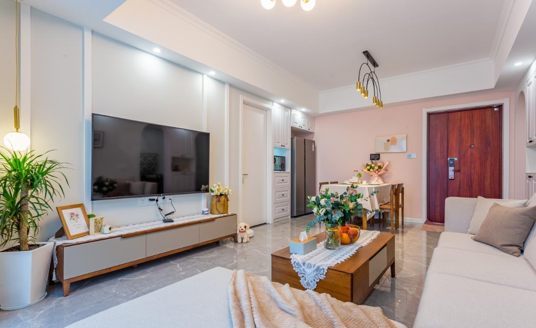 毅然去掉繁琐电视背景墙,简单的配色搭配美式画框,有限的空间,在视觉上放大了许多。