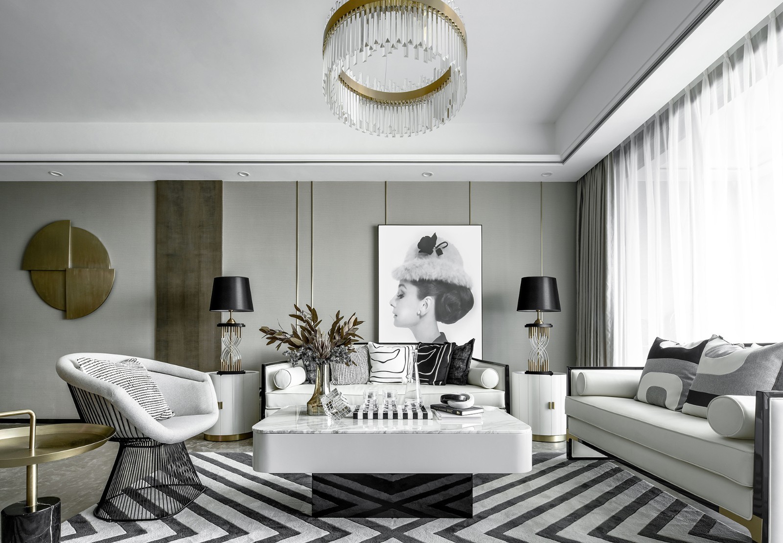 设计师采用白灰的色调将整个空间点缀,同时采用吊灯形式突出房间的文艺气息,线条的流动形式体现在背景墙,隐隐约约产生无限联想。