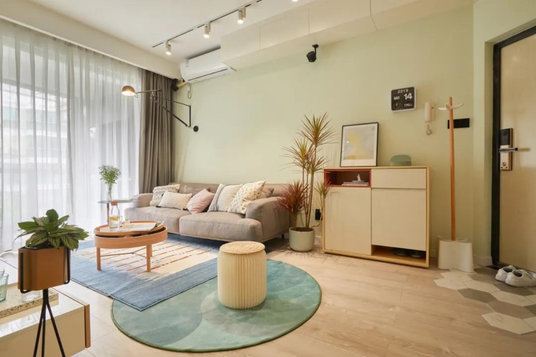 进门就是客厅,没有独立玄关区域,简单的衣帽架+鞋柜,简单收纳进出门物品,地面铺设六边形花砖,划分不同功能区。
