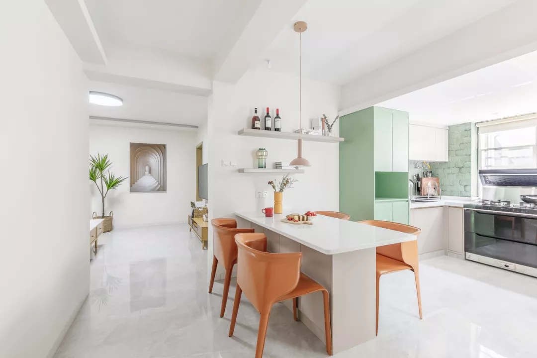 基调是干净的白色,搭配爱马仕橙色餐椅与抹茶绿的通顶收纳柜,整个用餐氛围都很清新。