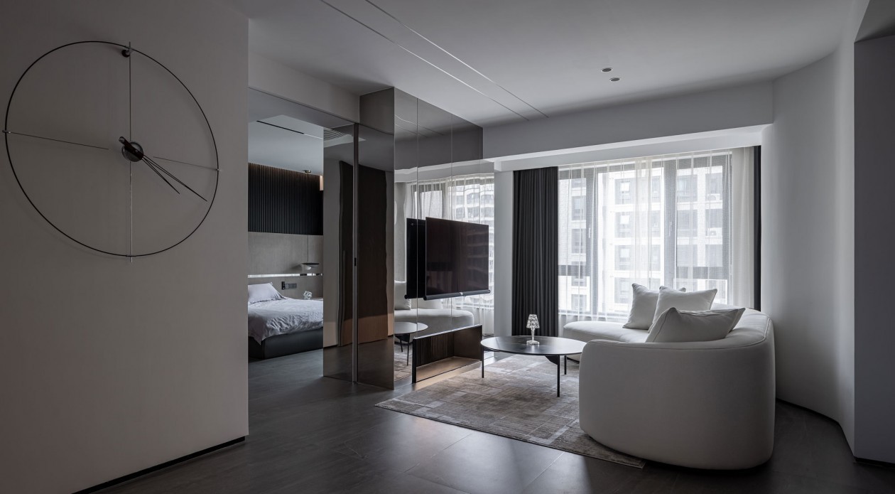 客厅与主卧之间,因客厅开间尺寸较小,所以选用镜面不锈钢装饰结构柱,不锈钢结构柱、电视背景与沙发之间组成洄游动线,区域串联使得空间更加流畅疏朗。行走间,可以看到镜面不锈钢让空间和物质产生不同角度的奇妙变形与扭曲,反射出新奇的视觉形象,同时模糊了边界,弱化了结构的厚重感。