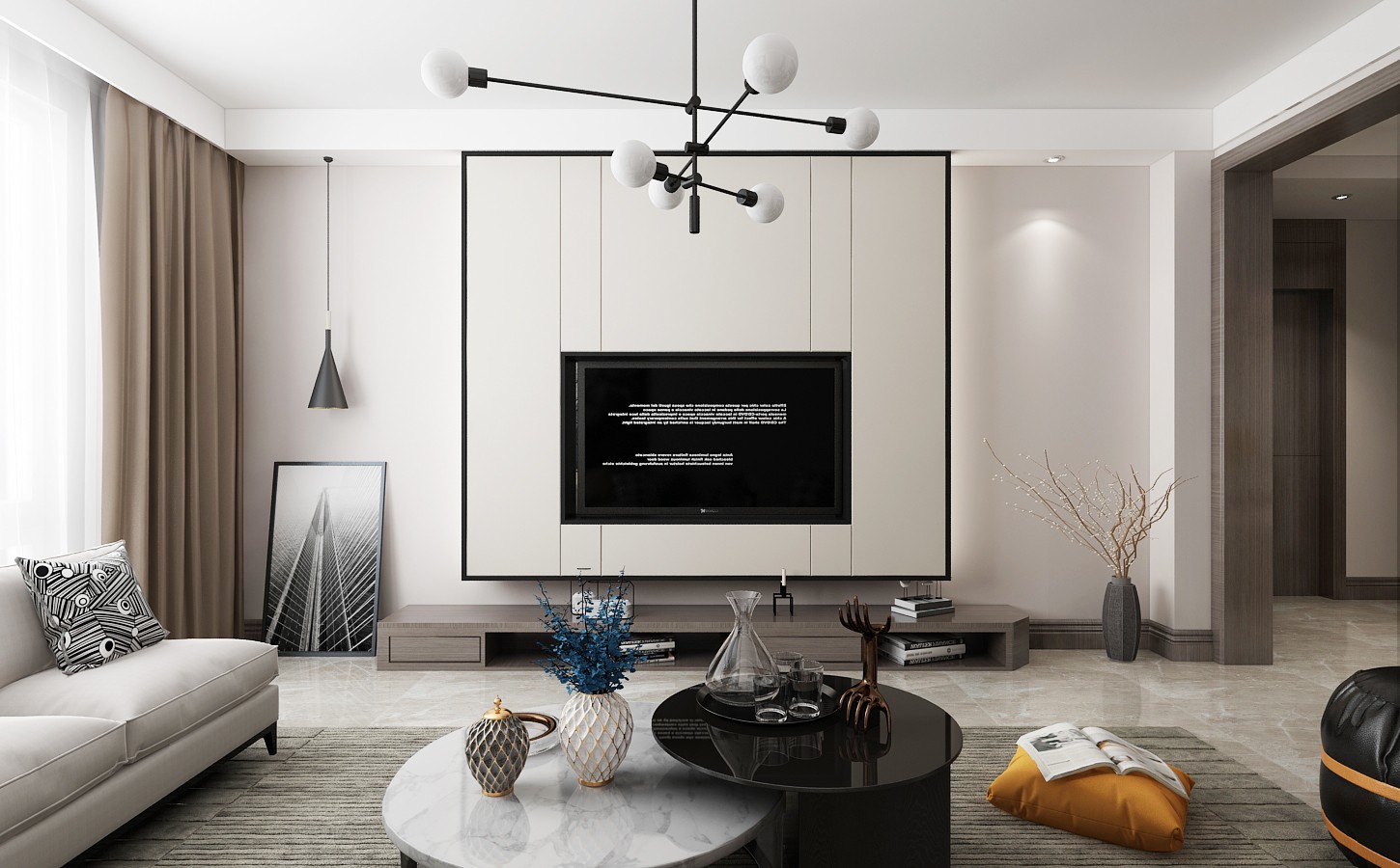 地面整体使用的暖色地砖,沙发背景加一块棕色的护墙板让整面墙不显得单调,白色的沙发和挂画的含义让客厅