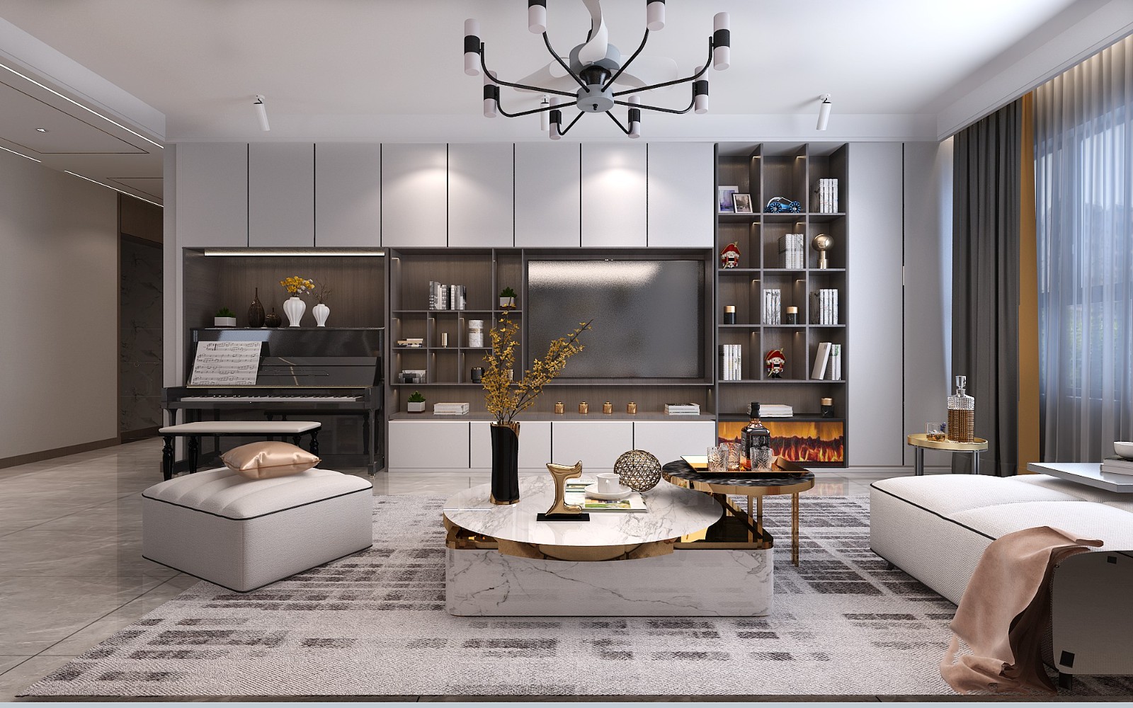 乳白色和香槟色的沙发搭配大理石茶几,营造出时尚精致的居家氛围。