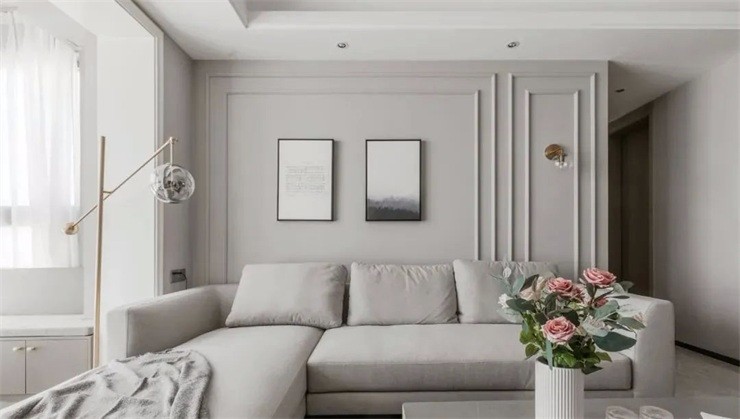 整个空间的色调以灰白色为主浅灰色的布艺沙发组合再加上奶灰色的墙面色让整个空间更加优雅白色的文化砖背景搭配樱桃木的电视柜组合为空间注入了几分自然气息与家的温馨感