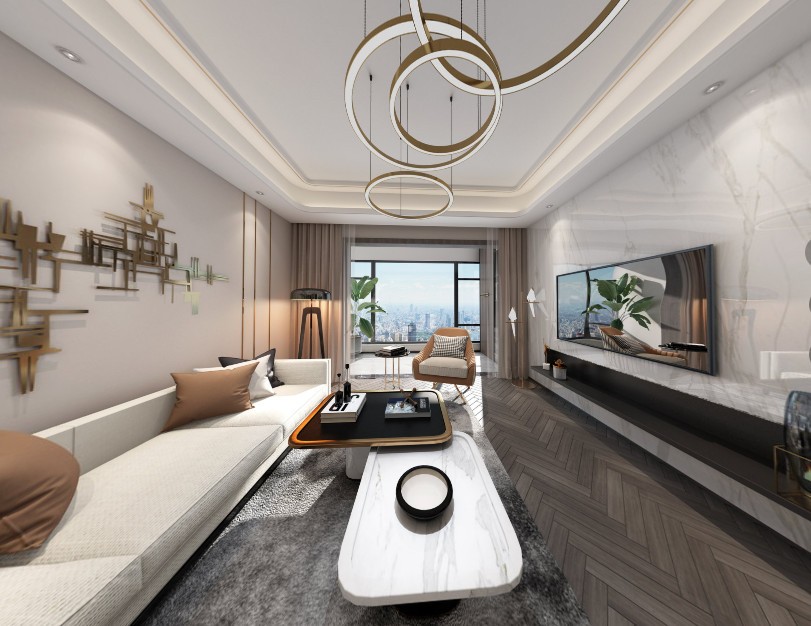 整面全石材电视墙,无过多修饰,墙面点缀简单线条,简洁明快,不失质感。 简约勾勒,为业主打造一个摆脱浮华,远离忙碌,家,回归简单回归宁静。