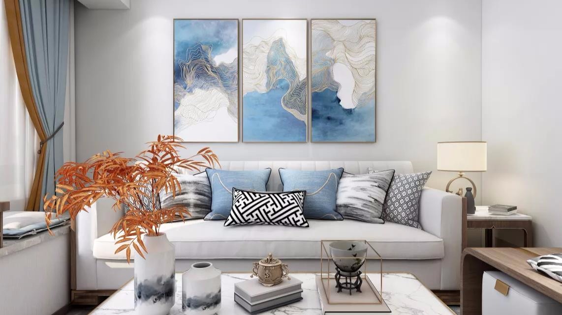 客厅采用大面积的白色,利用沙发的蓝色软饰以及沙发北京墙三联画的蓝色点缀,让整个空间都不显得单调