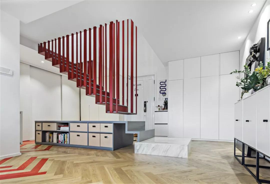 作为进门映入眼帘的***视觉, 设计师对楼梯的设计也是大动脑筋。 楼梯由两部分构建而成。 ***阶是白色的大理石踏步, 衔接一组带有两面储物的功能矮柜。
