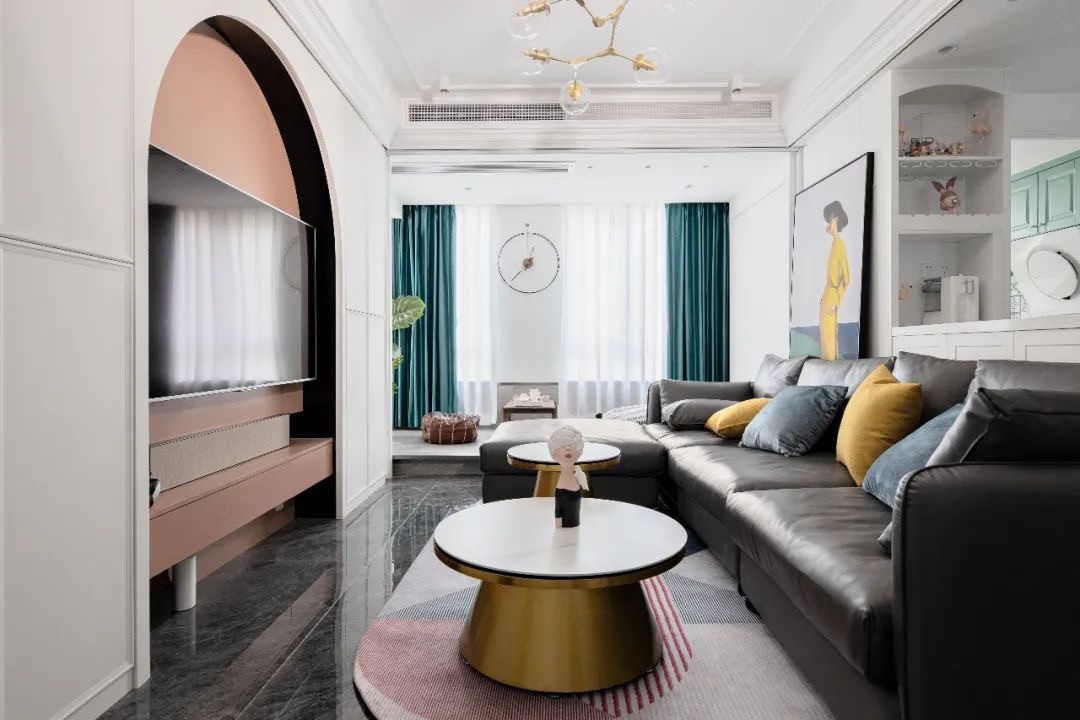 客厅,布置L型深色皮沙发搭配金属大理石茶几,加上亮色靠枕和个性装饰画,满满的时尚精致感。