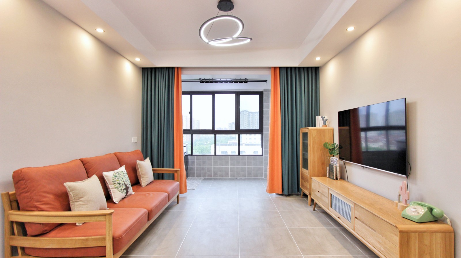 客厅空间利用原木以及大量橙色,营造温暖舒适的空间氛围。