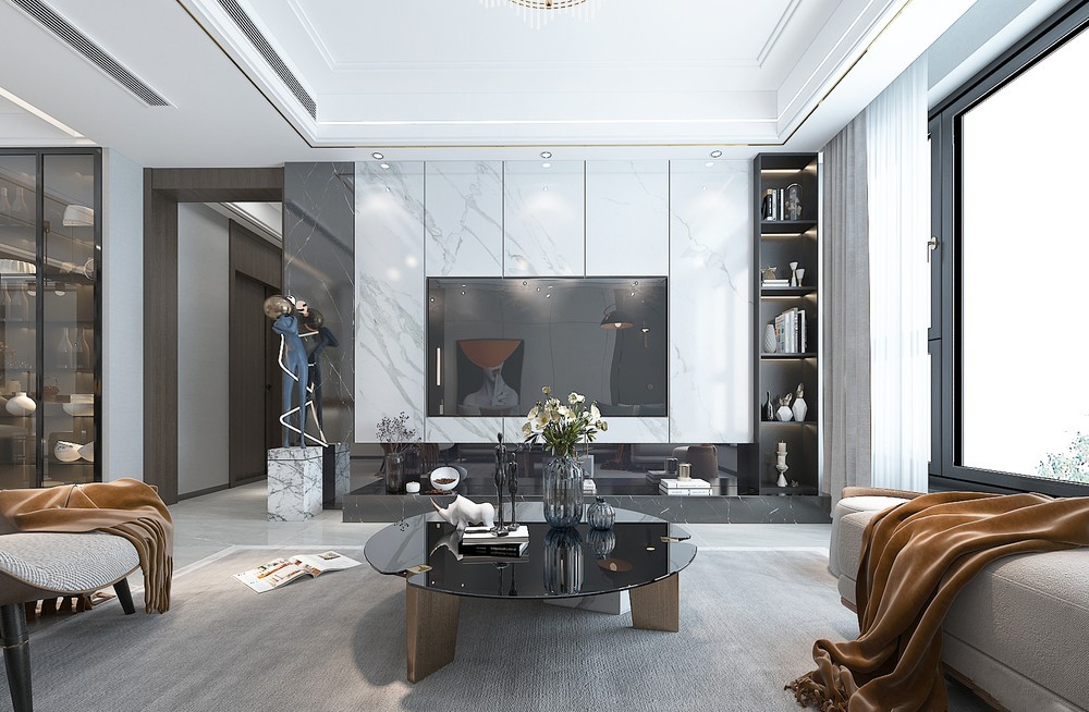 客厅的软装,极具现代感的沙发布艺搭配原木格栅,金属,护墙板。视觉上带有轻奢感。电视背景大理石内敛大气,装饰画元素的加入,让整个空间提升到新的高度,整个空间简单大气。在整体的客厅风格上面,加一些轻奢元素进去,让整个空间有着现代轻奢的感觉