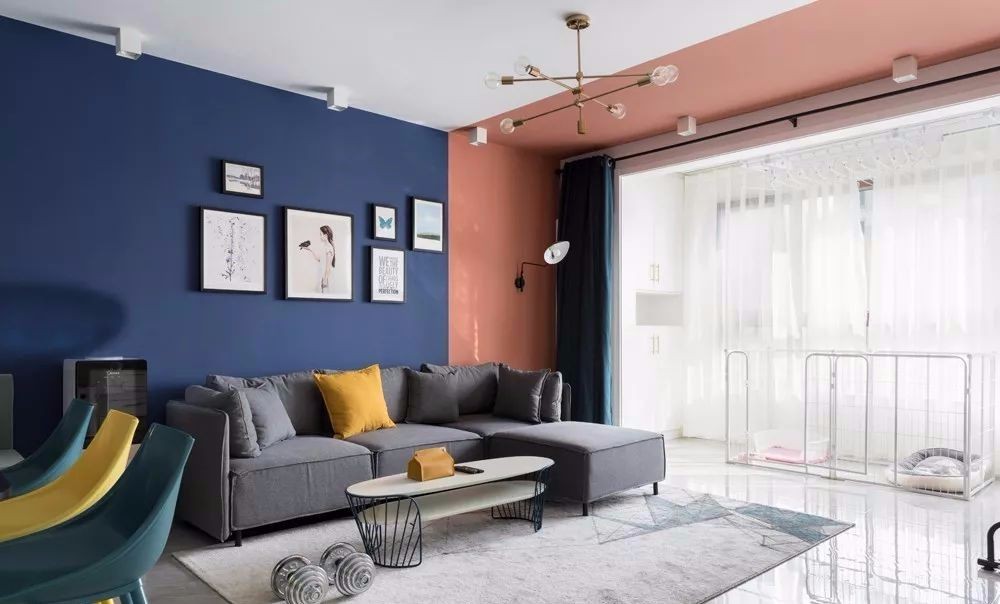 客厅背景使用了玄关区的那组撞色,冷色与暖色的碰撞,带来了强烈的视觉冲击,个性鲜明,年轻时尚。色彩比例的合理搭配,有冷静内敛的一面,也有张扬个性的一面。灰色的L型沙发,明黄的抱枕做为点缀,优雅而不失活力。