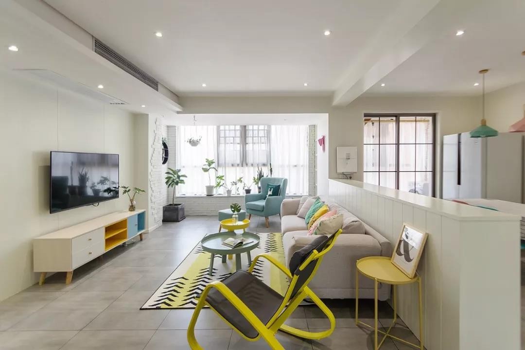 整个客餐厅都是以白色为主,顶部的筒灯代替了主灯的设计,显得格外简洁。舒适的布艺沙发搭配各种色彩的单椅、茶几和地毯,清新而又大方。