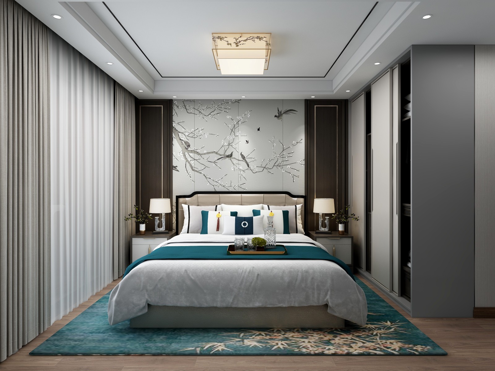 背景墙上的梅花与灯饰上的梅花形成呼应,地毯的孔雀蓝更显优雅,大气。