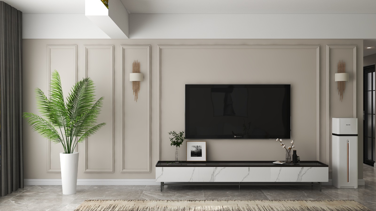 简洁的乳胶漆背景墙基础,根据电视墙的比例造型,装上边框线条,保持简约大方