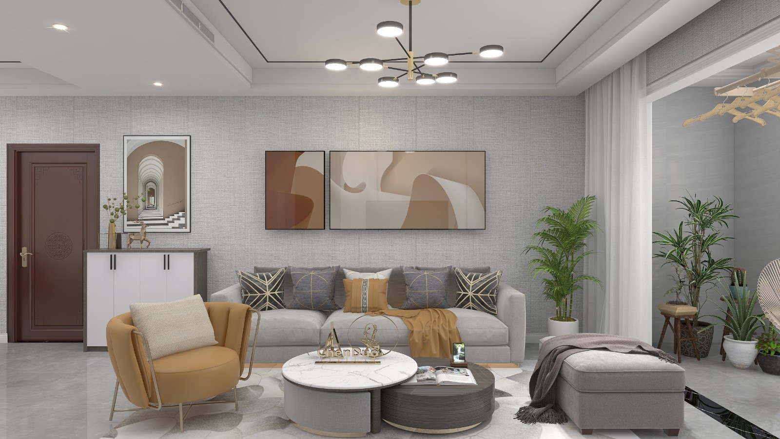 以灰色系为主色调,挂画金条边很有轻奢风,灯饰也很有特点。