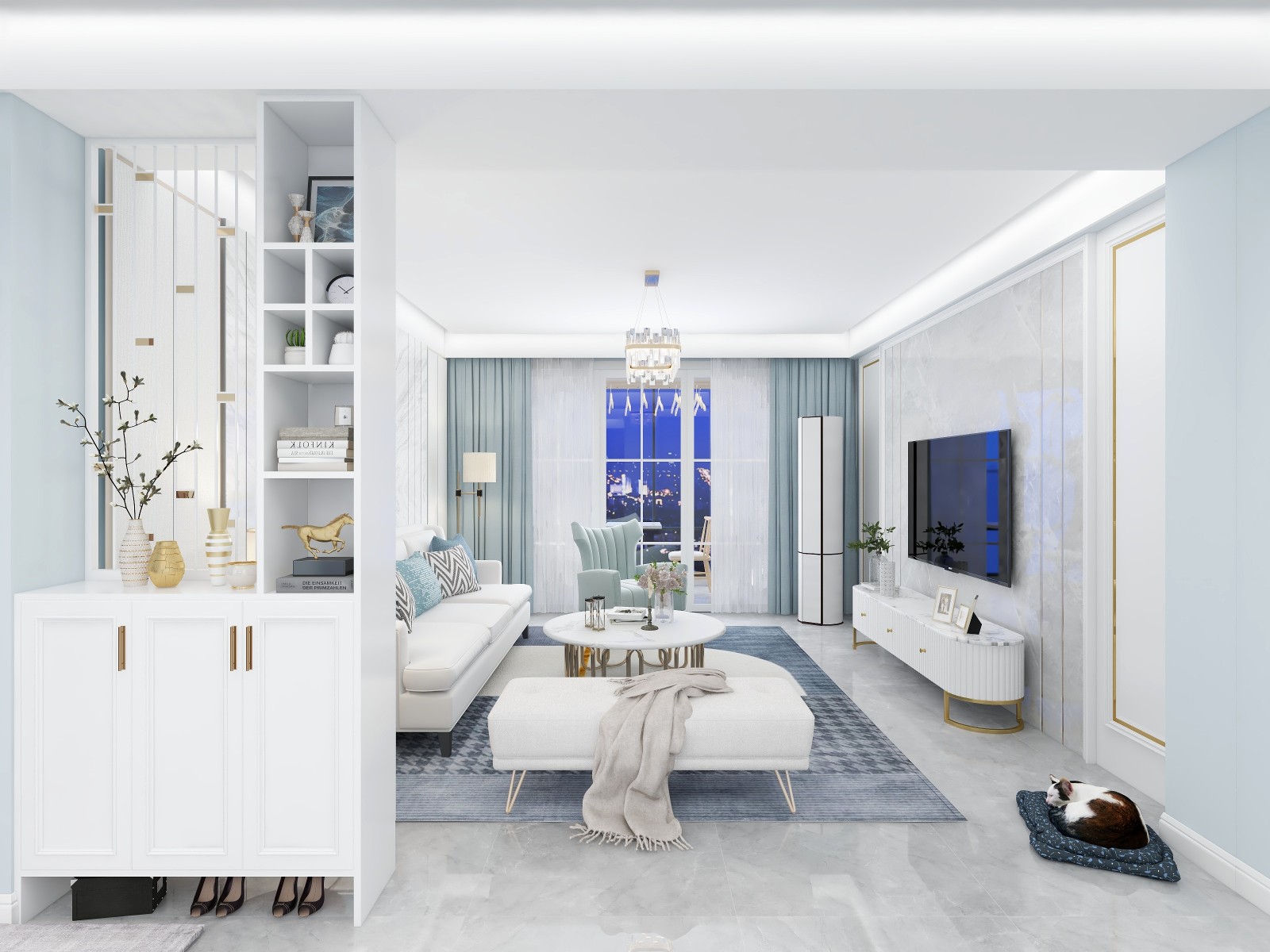 入门的鞋柜起到了装饰与隐私的作用,鞋柜整体以白色为主,搭配金色的拉手,不会显得单调。