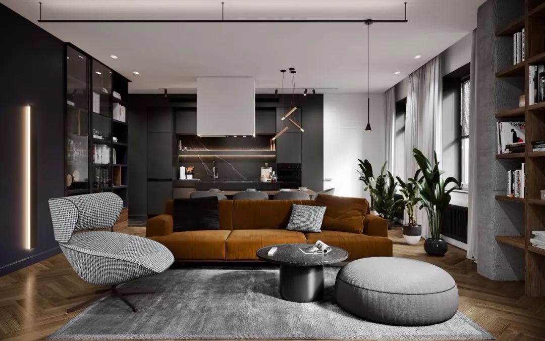 宽敞的起居室是公寓 中心,开放式的格局奠定明亮的空间感 以木色、白色筑起温暖舒压的氛围 并点缀些许黑色与沉稳靛蓝
