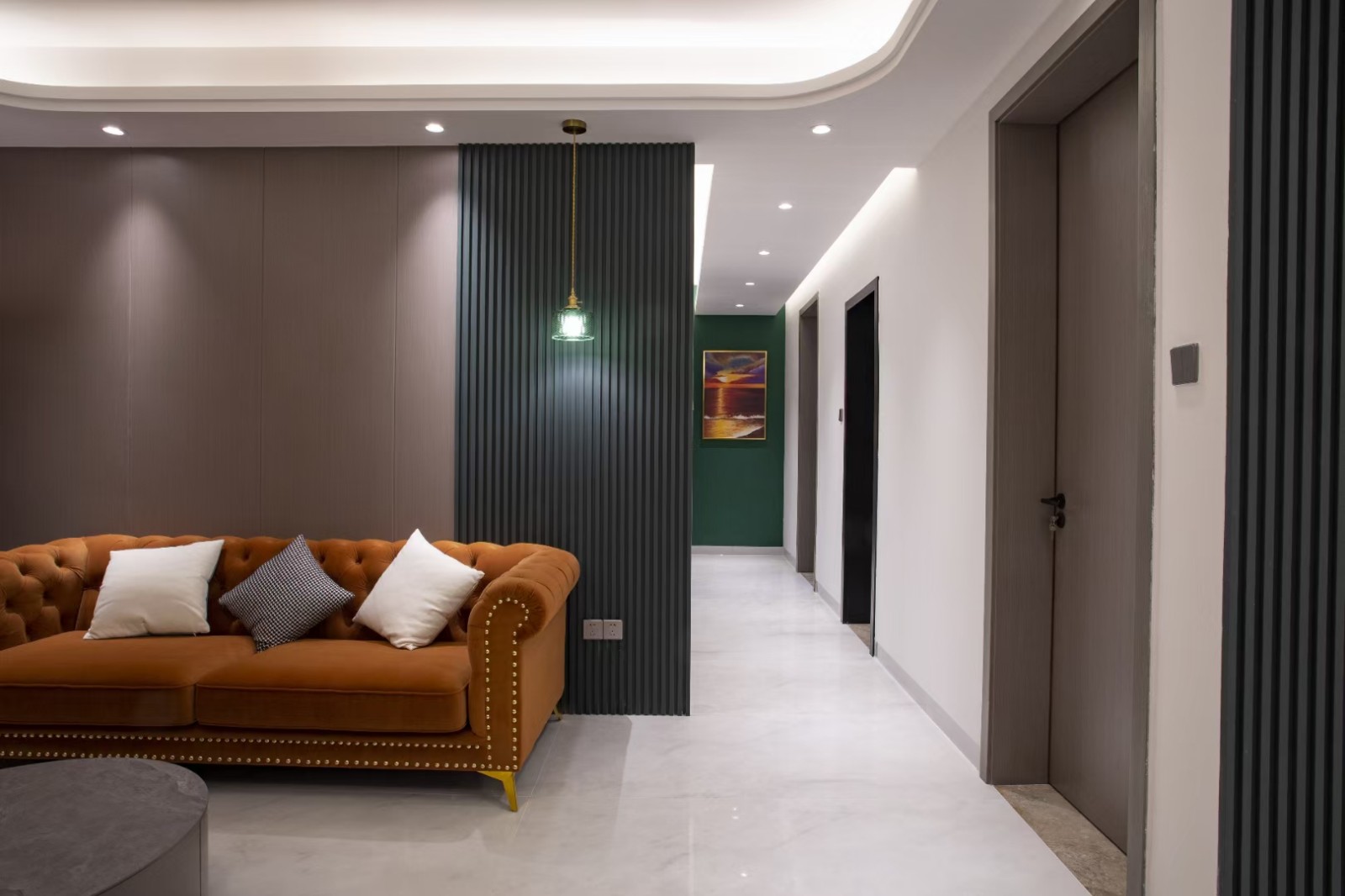 户型方正,本案例在与业主沟通时确定了***调,焦糖色+墨绿色的搭配。
