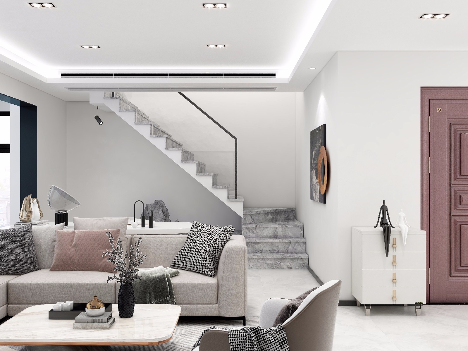 此房上下两层,一层空间做两室设计,主卧室、更衣室做套房,客厅书房结合,原有楼梯位置在电视背景处,妨碍流线,移动到书房后面。
