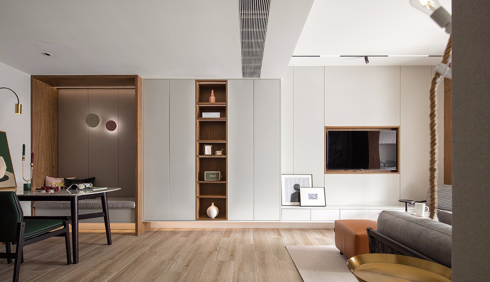 色彩的整体统一让客厅与餐厅产生对话,在材料质感的对比下,隐喻着一份文艺的腔调,客人的视线不停游走,小户型的纵深感随之而来。