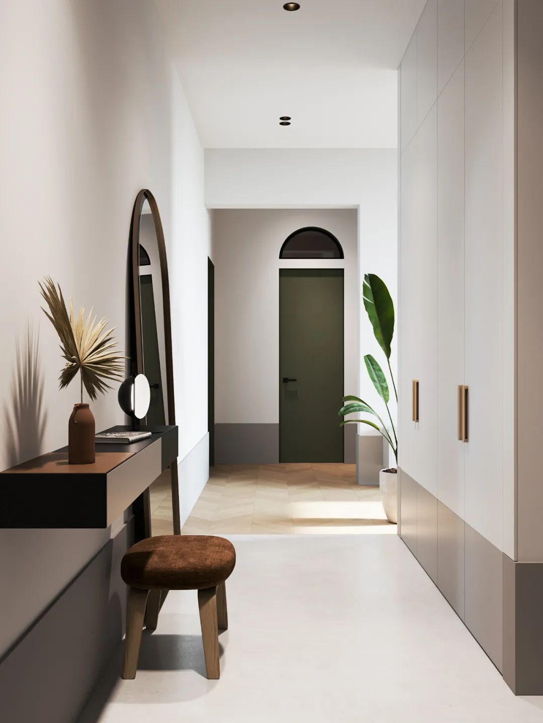 玄关处的过道一侧是穿衣镜、换鞋凳和化妆台的标准配置,设计师用尽可能细长的体型来铺垫,以至于让走道看起来不那么狭窄。
