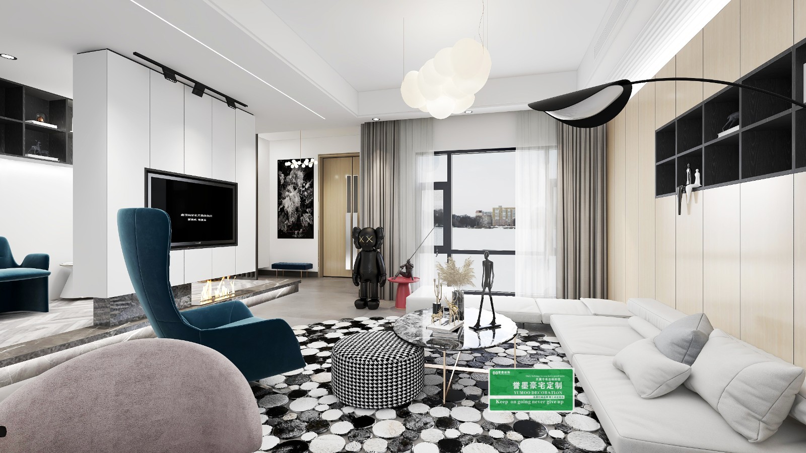 客厅简单的黑白灰色系,电视背景悬空柜造型、储物展示兼并、沙发整排储物柜来拓展收纳,柜子深色格明度上形成强烈对比,使空间质感更显硬朗简洁干净,进而打破单调界限。