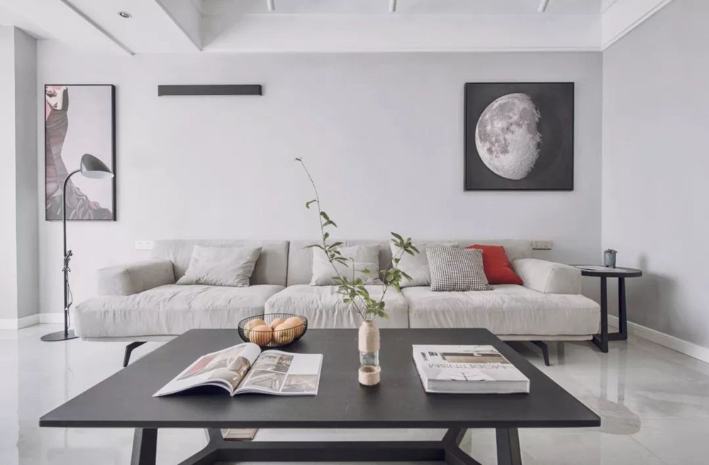 客厅的观赏角度,由此看去,犹如一轮明月将整个空间照亮,所有的软装都采用了素雅的白色和低调的黑色,空间层次感清晰。