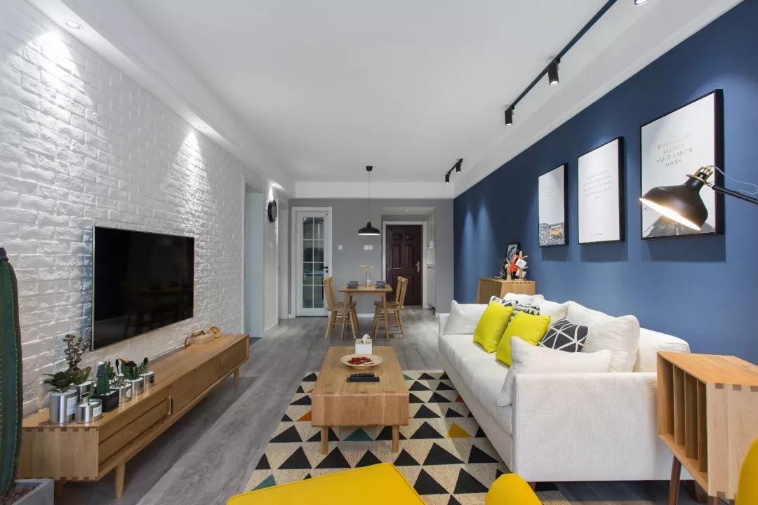 客厅沙发墙刷深蓝色漆,再搭配一组简约的挂画装饰,顶上导轨射灯的照射下,显得特别耐看;
