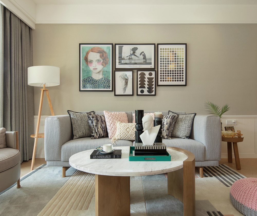 客厅以白色系与木色为主,搭配原木的家具,处处散发着自然舒适的气息,电视与背景墙融为一体,复古的石膏像摆放在木茶几上,满满的艺术气息扑面而来,清新自然又富有文艺感,简洁大方的设计,展现出层次感。