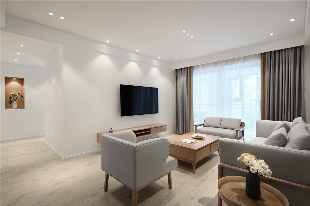 简洁干净的墙面,搭配原木色的布艺沙发,给人温馨的感觉