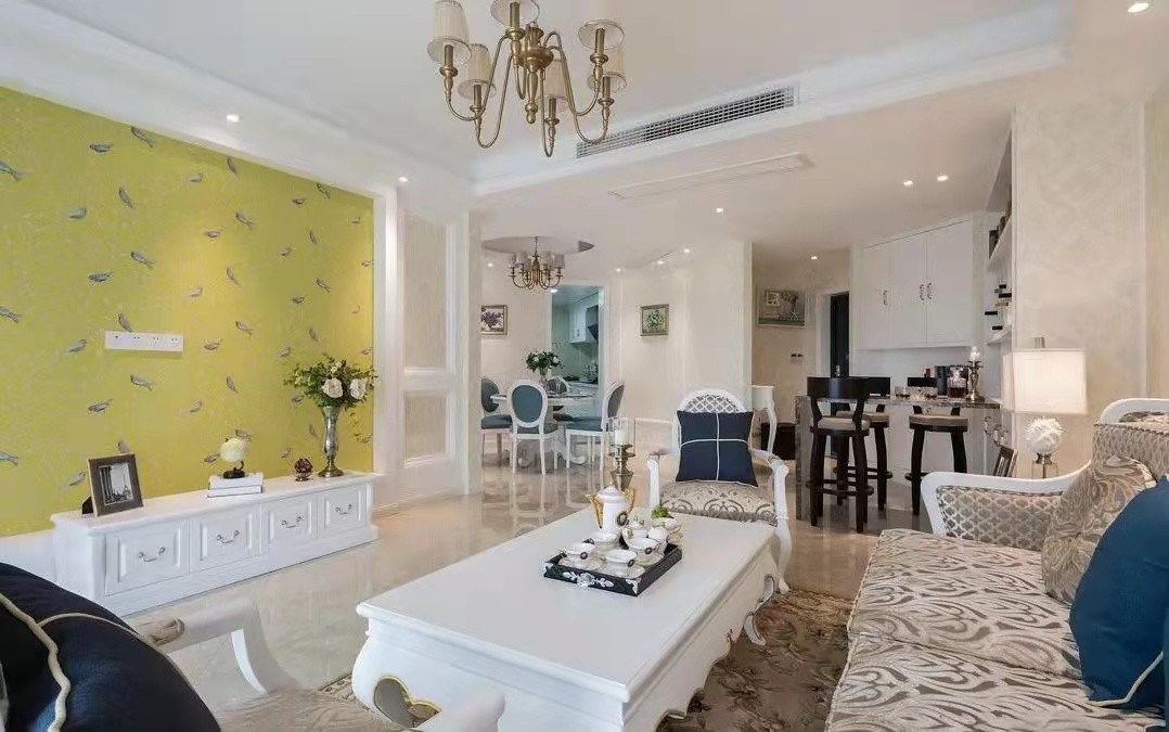 客厅多采用了带有图案的欧式经典壁纸与石膏板造型,搭配地毯、纯色浪漫经典蓝的窗帘等,俏皮的米黄色为整个空间带来一抹温馨,缔造出一个让人身心舒畅的写意空间。