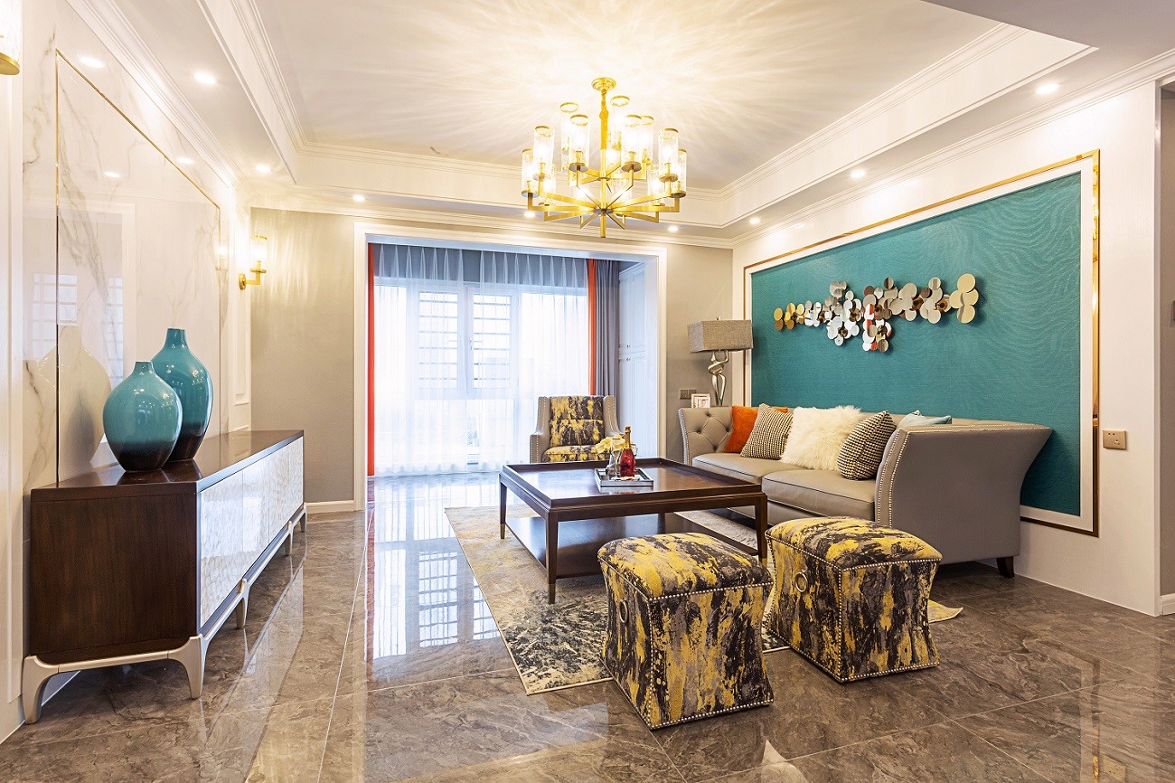 孔雀蓝做沙发背景,四周做了吊顶