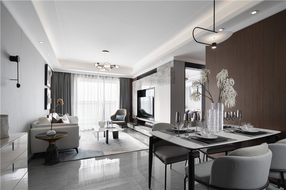 此案例装修风格为现代轻奢,整体色调以黑白灰为主