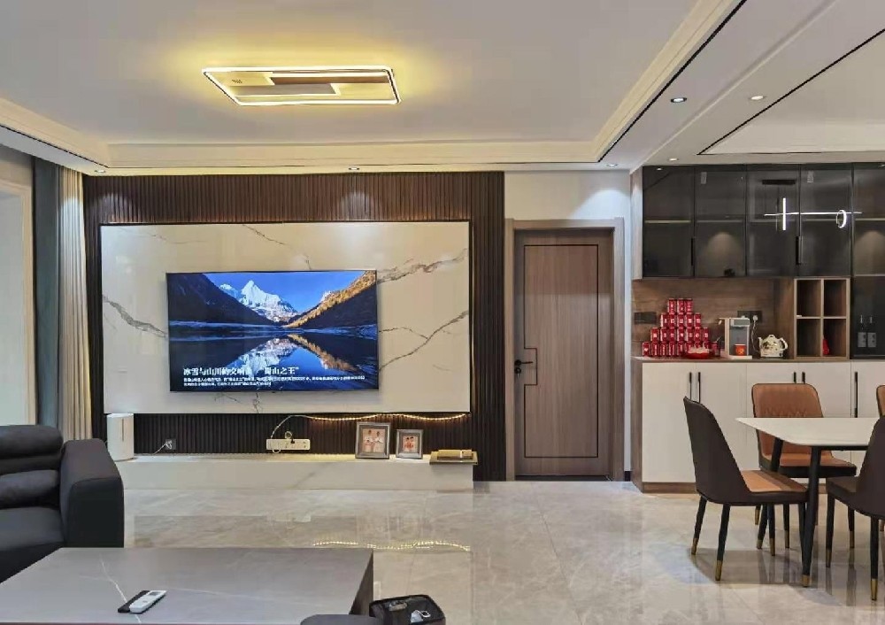 幅宽广场这一套房子本是四室两厅两卫,年轻业主想要客厅更大气一点,于是就将进门的书房拆掉和客厅规划到了一起,这样客厅足够大,沙发后面剩余的空间原本是打算做个吧台,目前还未施工完毕。
