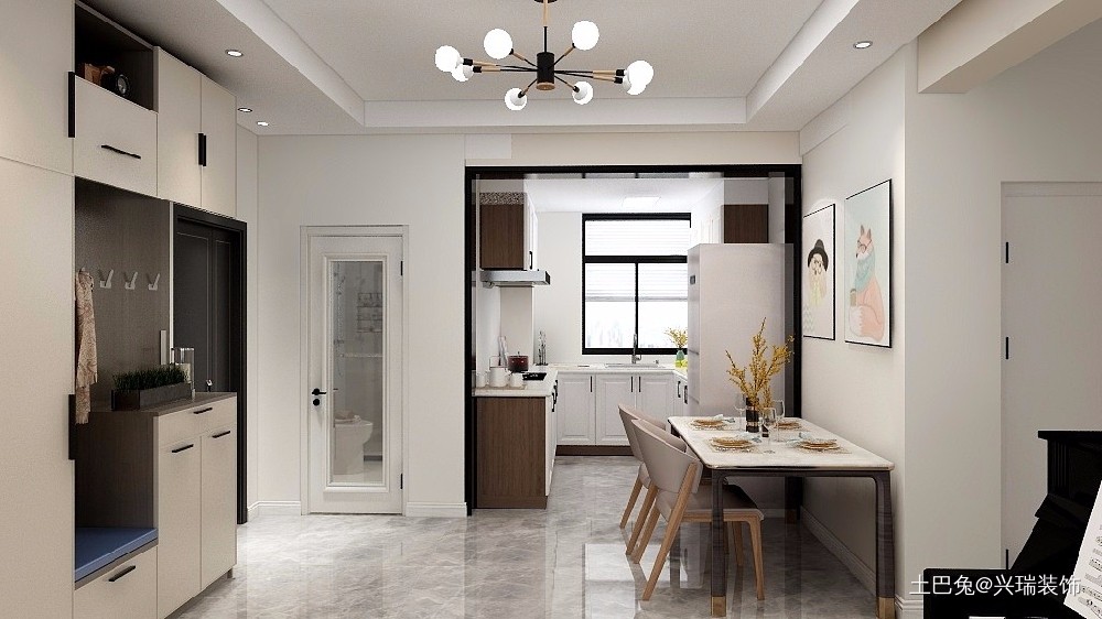 家里会有一个爱玩耍的小孩子,封闭式的厨房担心会夹到小孩子,于是暂时做成开放式,也使得客餐厅的采光度更高。温柔的材质,清新自然,让人在制作美食的同时,收获不一样的放松感。