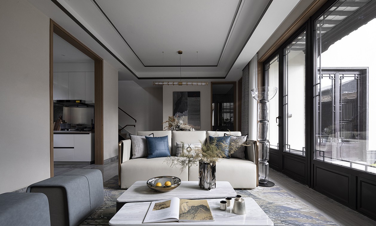 空间意境上以水为脉,取黛蓝色点缀其中,来诠释江海明珠的三重境界——立、守、得。