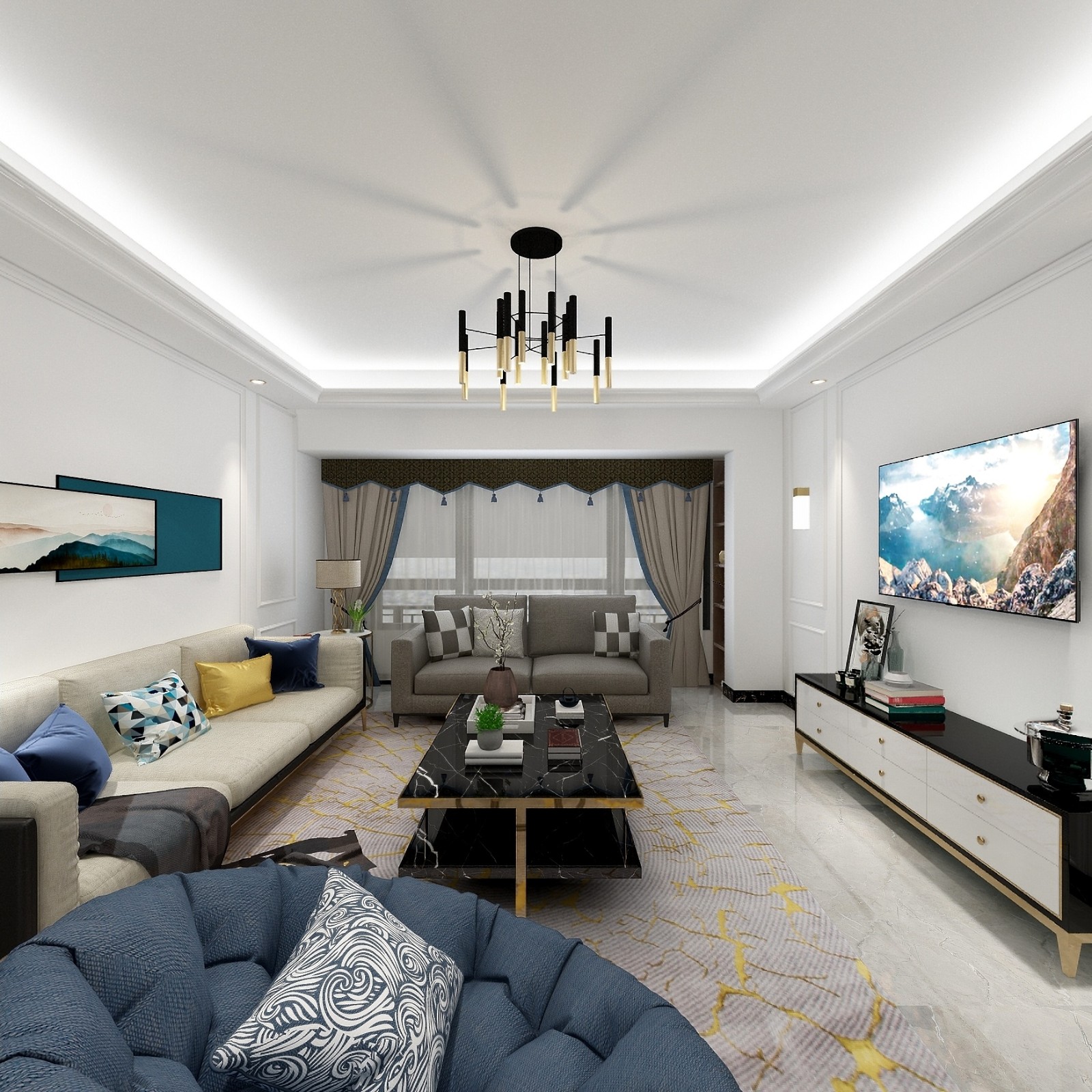 客厅以白色为主,干净整洁,墙面做简单的线条,房间门的线条根据墙面线条做隐形门