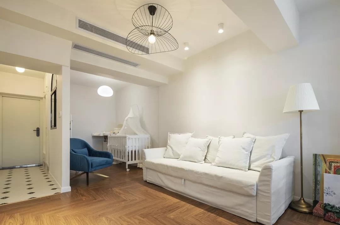 走过玄关就到了客厅和儿童房空间,儿童房现在是一个开放式的空间,内部摆放婴儿床和小桌子等,方便孩子玩耍