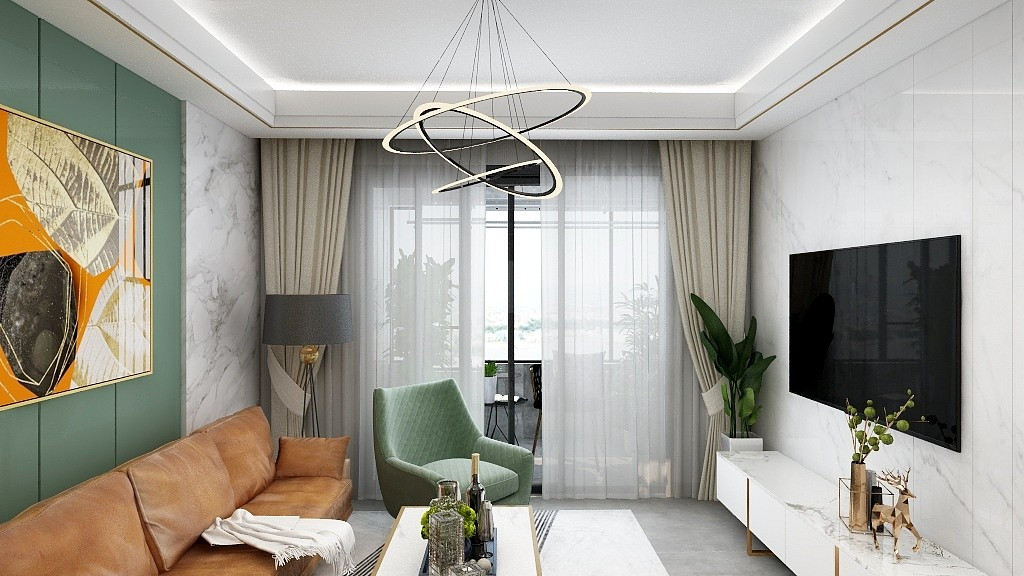 岩板背景,顶子和墙面都装饰钛金条,皮艺沙发搭配绿色乳胶漆,大胆时尚
