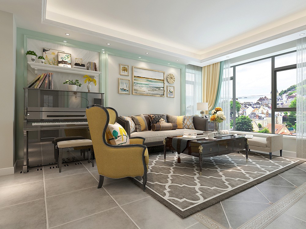 客厅的落地窗,让整个客厅更显明亮宽敞,对色彩也有了更多的包容度。沙发背景用绿色护墙板点缀,让人感觉更舒适 清爽