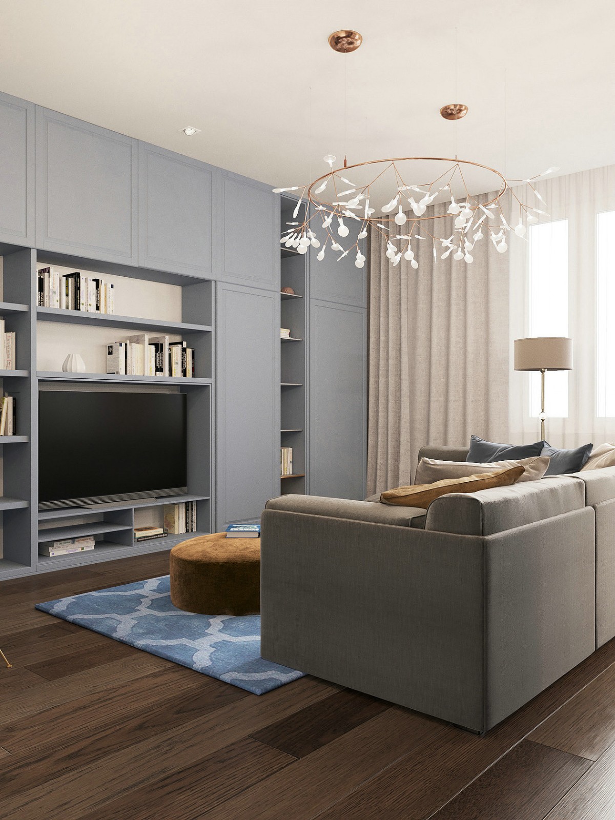 浅灰色定制储物柜与电视墙融为一体,在满足日常家居收纳需求的同时还能为家居环境增添亮眼的风景。