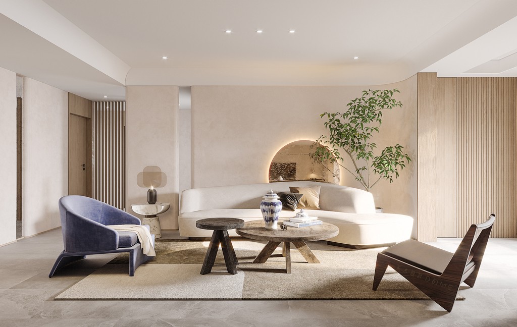 微水泥、原木、棉麻,烘托“侘” 无边框门+隐形踢脚线,塑造“简” 暖色调的侘寂风,让家更有温度