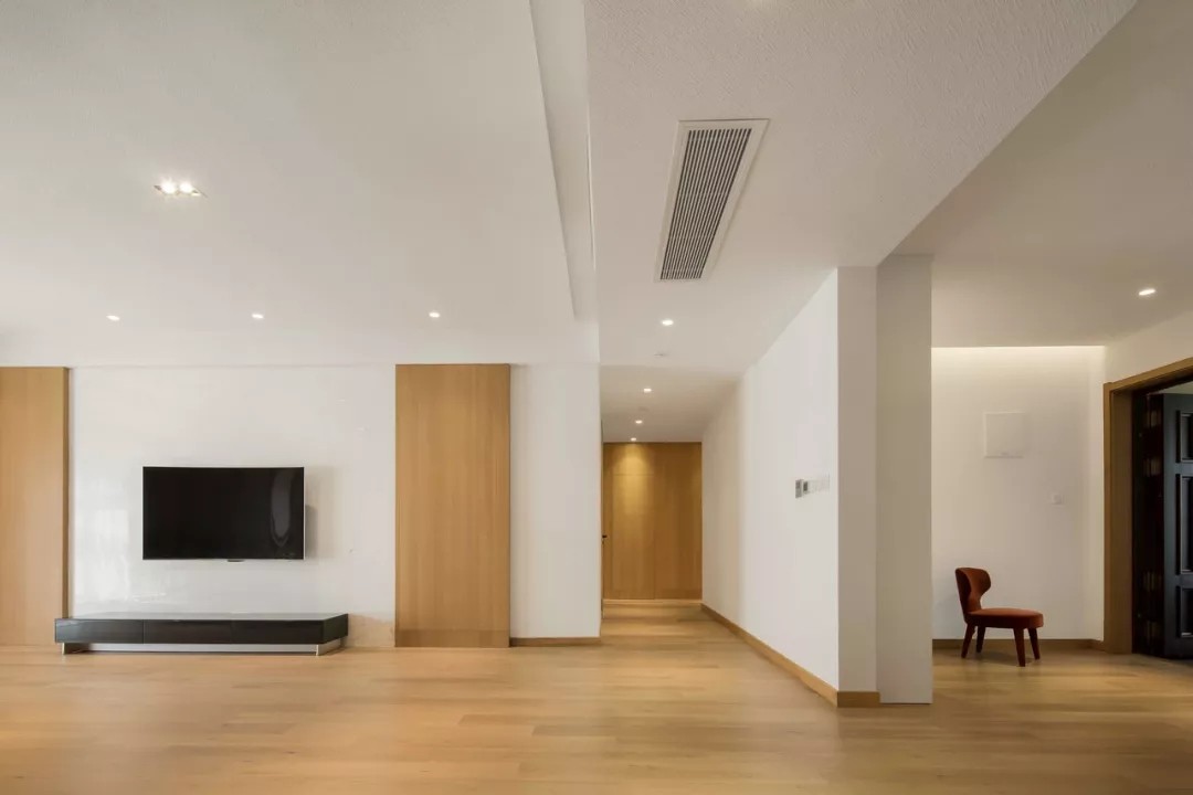 客厅的设计也是带着淡淡的禅意,用木饰面板做是沙发背景墙,电视背景墙的中间是留白的设计,两侧同样做了木质感的造型。