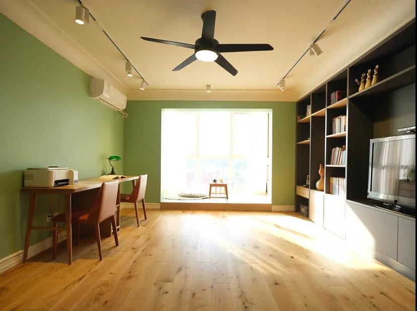 客厅打通了阳台空间,采光可以更多进入,显得简洁而明亮。取消了沙发的布置,整体显得宽敞舒适。左侧绿色墙面基础,布置一张双人书桌;右侧是定制书柜电视柜设计,整体蓝色的柜体与绿色墙体相呼应,营造出一种安静舒适的活力感。