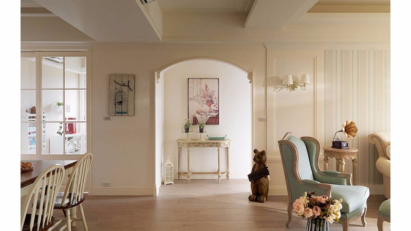 温暖干净的空间氛围里,简约的线板线条搭配半圆门拱设计,构筑美式乡村的基础样貌,再佐以文化石、格栅天花与美式家具,让风格完整到位。