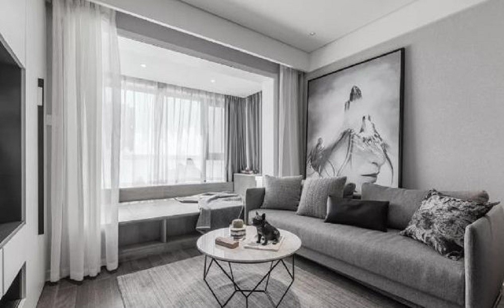 阳台处则是装了飘窗,日常玩耍放松再合适不过了。灰色的墙面,灰色的布艺沙发,灰色的装饰画,虽然都是一样的颜色,但是不同的深浅,让空间里的色彩元素变得有了层次感。