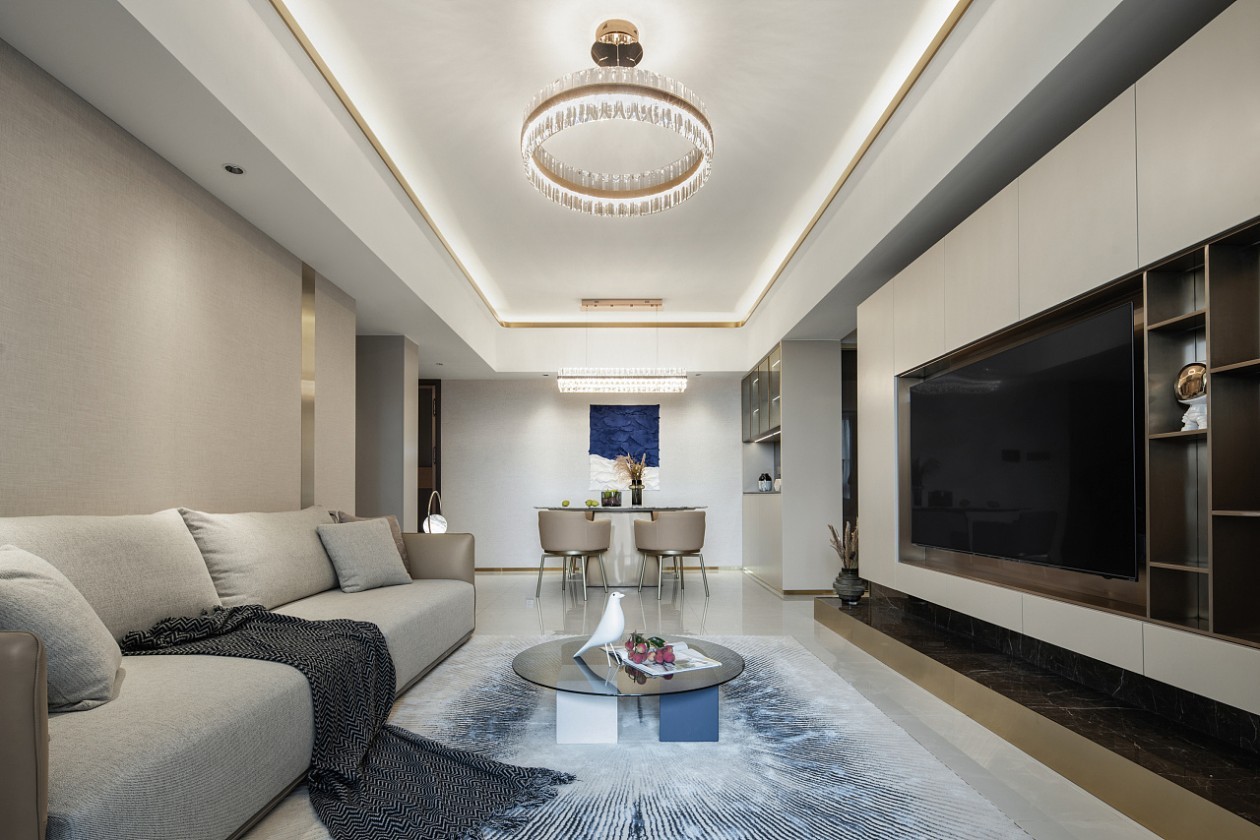 通过吊顶造型融为一体,整体过渡自然,视野开阔,却又利用过道巧妙的形成明确的功能分区,隔而不乱,天花板安装了好看的水晶灯,四周灯带设计很好的满足了客餐厅区域的照明,简洁又明亮。