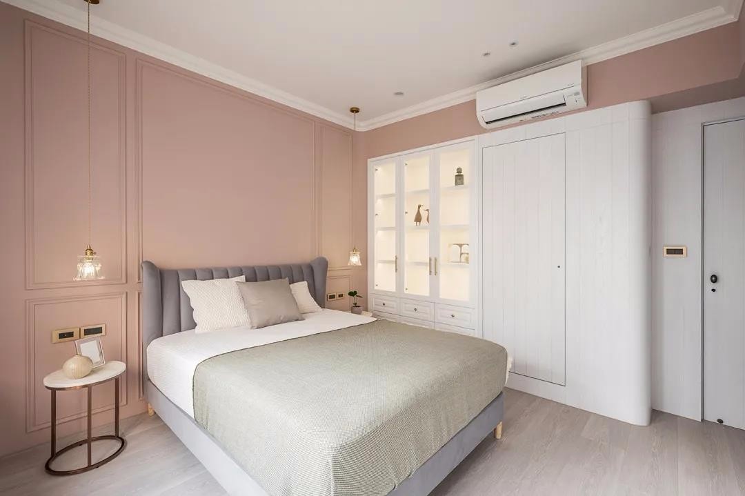 主卧房略带粉色,床头背景墙用线框装饰,带出空间层次感,床头靠背做了弧形设计让线条更为柔和,更具有延展性,同时床头两侧摆放小尺寸圆桌,取代床头柜更具有都市现代感
