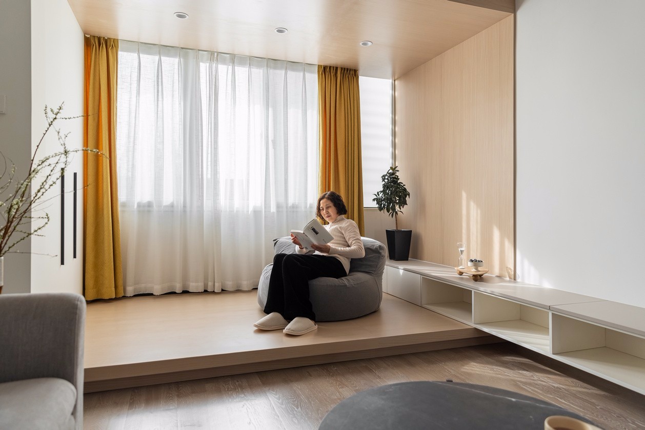 入户即见餐厅,整体空间由白色、原木、灰调构成,营造利落的视觉感。